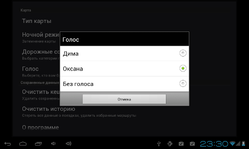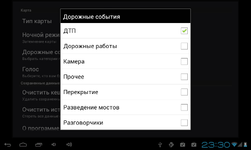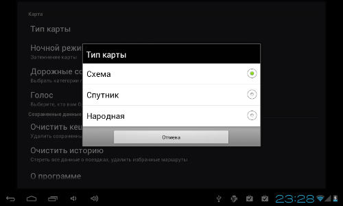 Настроек в «Яндекс.Навигаторе» немного. При конфигурации приложения можно выбрать вид карты (схема, спутник, народная), включить/выключить ночной режим (по умолчанию - авто), отметить события о которых «Яндекс.Навигатор» будет информировать, а также выбрать голос (мужской или женский). Кроме того, через меню настройки можно очистить кэш приложения и историю поездок. Причем, при очистке истории удаляется вся информация о поездках, включая избранные маршруты.