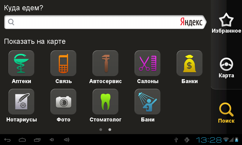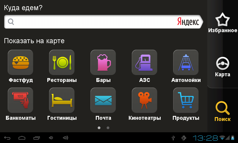 Последняя вкладка диалогового окна «Яндекс.Навигатор» служит для поиска точек интереса и других объектов. Для поиска используются база и «движок» Яндекса, а сам поиск может вестись как по адресу или названию, так и по типу точки интереса. В последнем случае на дисплее будут отображены все ближайшие точки интереса выбранного типа.