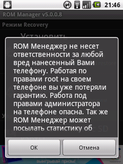 2. В выведенном на дисплей телефона диалоговом окне наживают «ОК», что подтверждает факт ознакомления с предупреждением о том, что «ROM Manager не несет ответственности за любой вред нанесенный Вами телефону»;