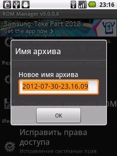 Выполнить операцию резервного копирования также можно через ROM Manager, для чего в меню приложения выбирают пункт «Сохранить текущий ROM» и вводят имя файла (по умолчанию предлагается использовать текущую дату и время)