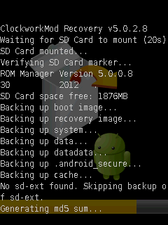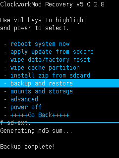 Для выполнения операции смартфон перезагрузится в режиме «Recovery», где и будет выполнено архивирование текущей ОС телефона. После успешного выполнения резервного копирования смартфон снова перезагрузится в обычном режиме. Файлы резервных копий сохраняются в папку \sdcard\clockworkmod\backup