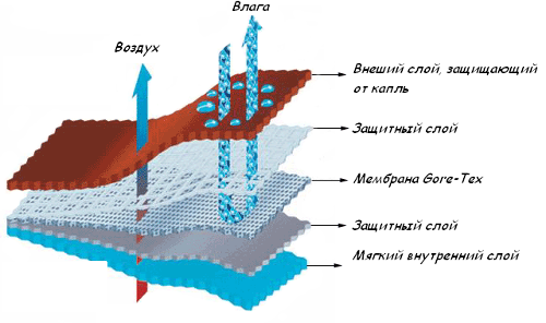 Одним из первых подобных материалов был Gore-tex, представляющий собой многослойную систему. Центральный элемент Gore-tex – мембрана, изготавливаемая из фторопласта и представляющая собой пленку с большим количеством микроскопических отверстий (несколько миллиардов пор на квадратный сантиметр). В настоящее время срок действия патента на Gore-tex истек, что позволило появиться на рынке и другим материалам, основным на аналогичных принципах. Кстати, схожие мембраны используются и при изготовлении чехлов, защищающих от влаги аппараты изначально лишенные подобной защиты.