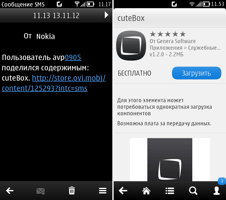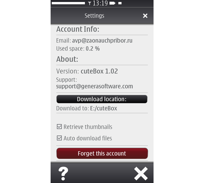 Бесплатная программа cuteBox представляет собой «легкий Dropbox-клиент для Symbian^3 устройств». Описание приложения в Ovi Store довольно краткое – для программы заявлена поддержка всех функций мобильной версии Dropbox, включая загрузку (на телефон и с телефона), копирование, перемещение, удаление файлов, а также возможность поделиться публичной ссылкой на файл. При этом подчеркивается минимальное использование трафика за счет кэширования списка файлов и загрузки миниатюр.