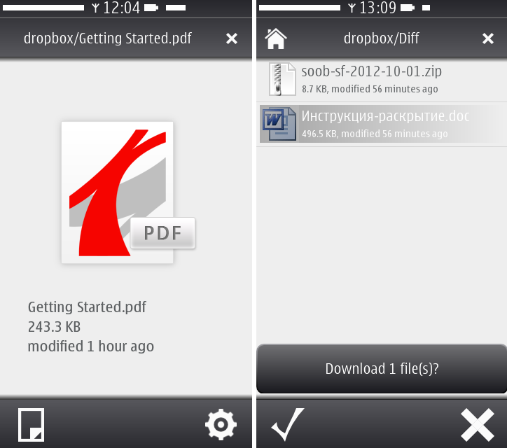 Аналогичная панель доступна и для файлов, а для ее появления следует коснуться строки с именем файла. Из того, что не понравилось в работе DropML отмечу «подвисание» интерфейса приложения во время загрузки файла – операция выполняется не в фоне, а в основном режиме программы, что при медленном соединении может быть не очень приятно. Если файл уже был загружен на мобильное устройство, то DropML отображает звездочку возле его названия, а при попытке повторной загрузки запрашивает подтверждение.
