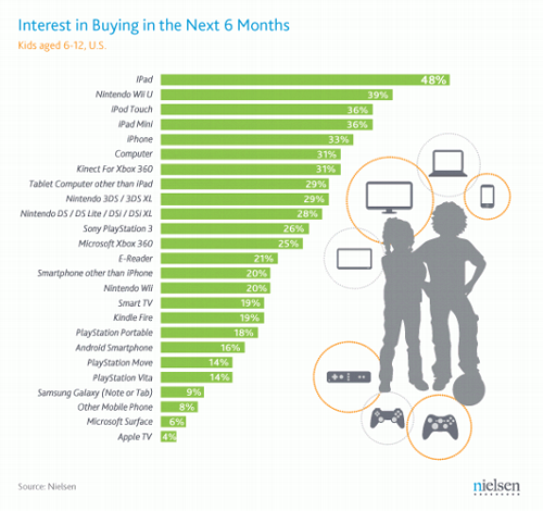 В США все прозаичнее – в этой стране царствует Apple и даже маленькие американцы чаще всего просят у Санта-Клауса технику именно этого производителя. Почти половина опрошенных Nielsen ребятишек в возрасте от 6 до 12 лет мечтает получить полноразмерный iPad, а 36% - iPad Mini. От iPod Touch и iPhone не отказались бы 36% и 33% соответственно. На втором месте - Nintendo Wii U, она является мечтой 39% опрошенных детей. Но все-таки четыре позиции из пяти наиболее желанных продуктов принадлежат технике Apple. Даже компьютеры заняли только шестое место.