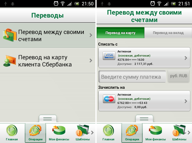 Перевод денежных средств возможен между своими счетами, либо другому клиенту Сбербанка. Однако в последнем случае понадобится наличие готового шаблона, созданного в web-версии.