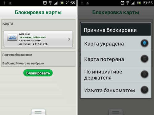 Блокировка банковской карты выполняется буквально в одно касание – выбирают карту и нажимают кнопку «Блокировать».