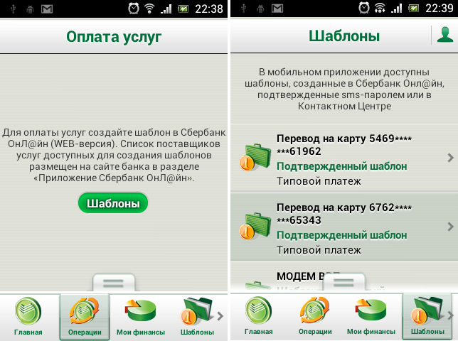 Однако, большинству потенциальных пользователей мобильного приложения «Сбербанк ОнЛ@йн» наиболее интересен пункт меню связанный с оплатой различных услуг. Как уже упоминалось, платежи из мобильного приложения можно производить на основе шаблонов созданных в web-версии. Для просмотра доступных шаблонов служит одноименная вкладка основного диалогового окна мобильной версии «Сбербанк ОнЛ@йн».