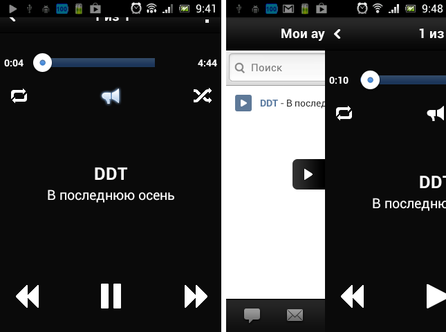 Слушать музыку можно в фоновом режиме, а для перехода к плееру (если он запущен) служит «язычок» в правой части экрана.
