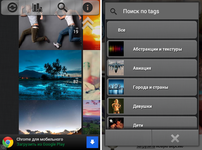О назначении приложения «Обои и картинки» легко догадаться по его названию. Посредством программы можно обращаться к интернет-базе изображений, которые можно использовать в качестве фона рабочего стола смартфона или планшета. Для облегчения поиска картинок служат двухуровневый фильтр по категориям и система рейтингов. При желании в базу изображений можно добавить свои картинки, для чего переходят на сайт vandroids.com. По заявлению разработчика – «все изображения высокого качества HD». Понравившиеся изображения можно заносить в избранное, а при загрузке – выбрать подходящее разрешение.