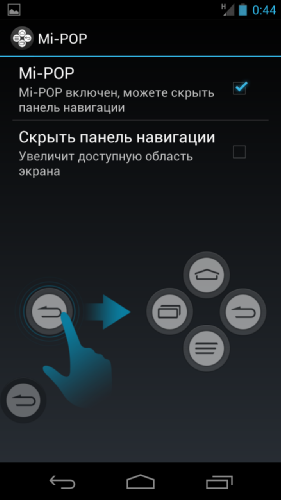 Отмечу и одно крайне интересное программное решение - приложение Mi-POP. После активации данного виджета у вас появляется возможность отключить стандартные сенсорные кнопки ОС Google Android в нижней части экрана. За счет этого в распоряжении пользователя оказывается 100% поверхности экрана. С включенным нижним рядом кнопок размер экрана составляет 9,1х5,6 см, с активированным Mi-POP - 9,8х5,6 см.