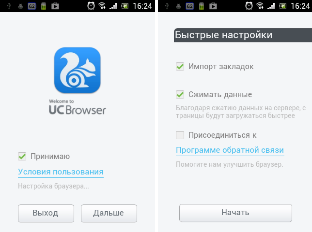 При первом запуске UC Browser будет предположено принять условия лицензионного соглашение, а также разрешить импорт закладок и сжатие трафика.
