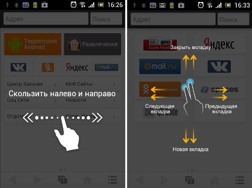 При взаимодействии с пользователем в UC Browser активно используется жестовое управление. В частности с помощью сдвига двумя пальцами влево или вправо можно переключаться между вкладками, а сдвиги вверх и вниз предназначены, соответственно, для открытия новой вкладки и закрытия текущей.