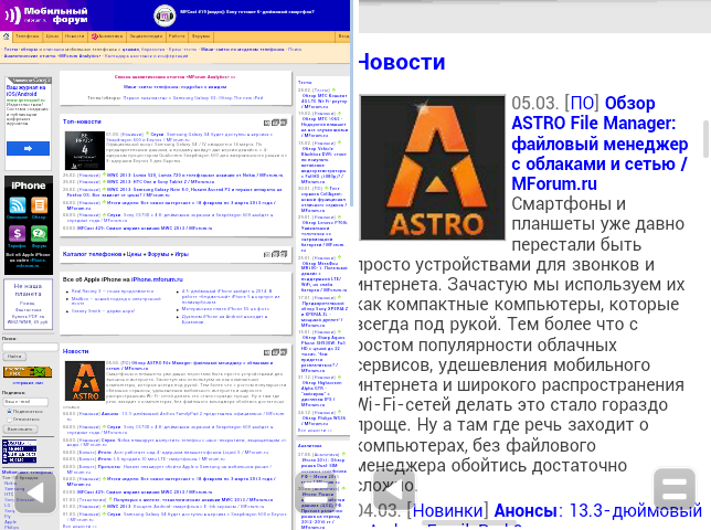 В режиме просмотра web-страниц сначала загружается ее миниатюра, а при касании нужного фрагмента – он масштабируется под размер экрана. Причем, масштабирование реализовано очень неплохо – под размер и разрешение экрана подгоняется не только форматирование текста, но и размеры изображений. Кроме того, при просмотре web-страниц на экране отображаются две полупрозрачные кнопки, одна из которых служит для возврата назад, а вторая – для вызова меню приложения.