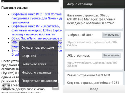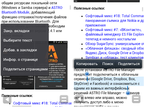 При длинном тапе по текстовому фрагменту web-страницы на дисплей выводится меню, позволяющее: закрыть текущую вкладку, выделить текстовый фрагмент, добавить текущую страницу в закладки и поделиться ей. Также доступен просмотр сводной информации о текущей странице. При выделении текста его можно не только скопировать в буфер обмена, но и, без выполнения промежуточных операций, поделиться им или поискать в интернете похожие текстовые фрагменты. В качестве поисковика «по умолчанию» используется Яндекс.