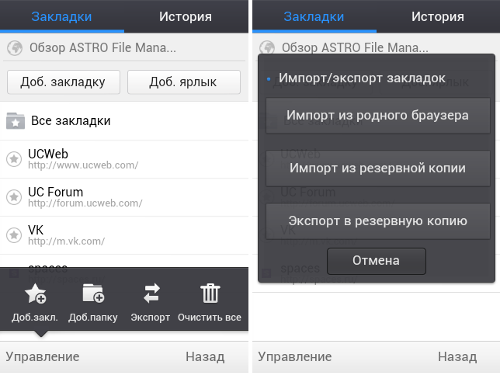 Доступ к «избранным» сайтам и истории просмотра выполняется через диалоговое окно, вызываемое по касанию кнопки «Закладки» в меню приложения. Для закладок доступно упорядочивание по папкам, обмен со стандартным браузером и резервное копирование. Кроме того, через менеджер закладок можно добавлять ярлыки на экпресс-панель брауезера.