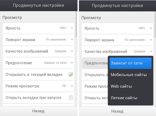 Настройки UC Browser довольно гибкие. Например, можно установить яркость (причем действовать она будет только для браузера) и зафиксировать ориентацию изображения. Другая полезность – возможность указать версию сайта, которая должна загружаться «по умолчанию» (при просмотре некоторых сайтов с планшетных ПК или смартфонов с большим дисплеем – незаменимая вещь). Кроме того, можно ограничить качество загружаемых изображений.