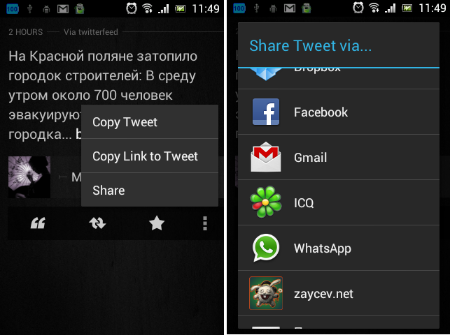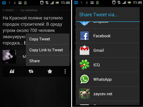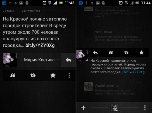 Причем для этого в Carbon можно использовать как короткий, так и длинный тап. В первом случае выбранный твит будет открыт в отдельном окне, а во втором – лента сообщений, кроме выбранного твита, будет затемнена, а на экран выведено контекстное меню, позволяющее ответить на сообщение, ретвитнуть его (как с корректировкой, так и без), а также занести в «избранное». При просмотре твита в отдельном окне (по короткому тапу) под ним отображается меню позволяющее скопировать текст или гиперссылку в буфер обмена, а также поделиться твитом посредством других приложений, например Facebook, ICQ или почты. Довольно удобно и то, что открыв сообщение можно прочесть всю цепочку его обсуждения. Переход между сообщением и его обсуждением сопровождается приятной анимацией.