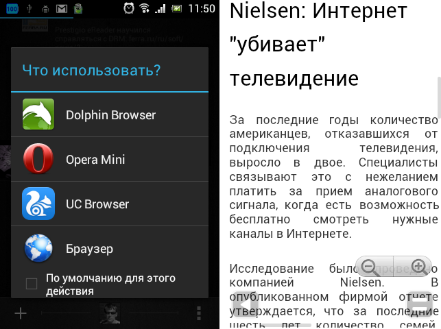 В случае если на мобильном устройстве установлено несколько браузеров, то при касании гиперссылки будет предложено выбрать нужный.