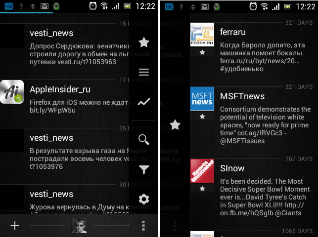 Что же получилось на практике? На мой взгляд – очень стильное приложение, со строгим черно-белым интерфейсом. Причем, он очень логичен, прост, функционален. И это подкупает. На экране смартфона нет никакой лишней информации, надписей или других подобных элементов, которые отвлекают пользователя от главного – ленты сообщений. Наоборот, в Carbon именно лента сообщений стала центром, а весь функционал приложения – надстройкой, которая дает возможность ее комфортно читать.