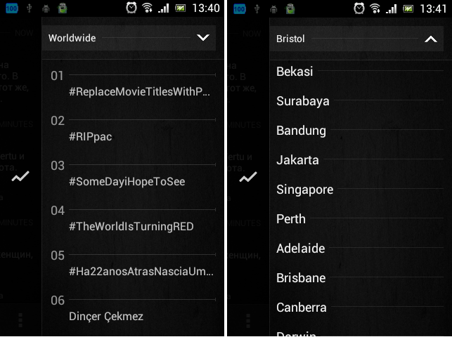 Также в Carbon доступен список трендов, причем можно смотреть как общемировые, так и локальные. Однако локальные тренды искать неудобно – чтобы выбрать нужное место необходимо листать длинный список, а функции поиска или хотя бы сортировки по алфавиту не предусмотрено.