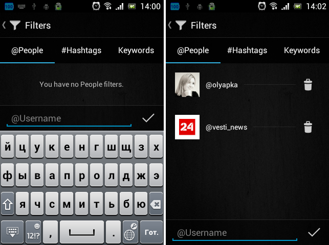 Еще одна удобная функция Carbon – фильтры, которые можно создавать по людям, хэштегам или ключевым словам.