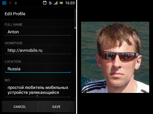 Для перехода к собственному аккаунту служит кнопка с вашим аватаром в центре нижней панели инструментов. Возможности по работе с аккаунтом во многом стандартны. В частности можно просматривать подписки и списки подписчиков, а также управлять ими. Довольно удобно и то, что для каждого контакта видно состояние взаимной подписки и присутствуют кнопочки «Unfollow» / «Follow». Кроме того, непосредственно из списка подписчиков можно написать ответ (@имя) или личное сообщение выбранному пользователю, а также добавить его в списки (LIST), фильтры, заблокировать или отметить как спаммера. Также из Carbon можно отредактировать свой аккаунт (имя, адрес сайта, местоположение и описание), для чего касаются кнопки «Edit». А вот фото заменить не удастся – можно только просмотреть его в более крупном масштабе.