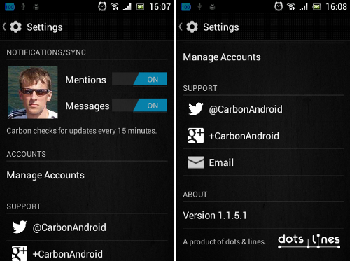 Настроек в Carbon минимум, точнее сказать их почти что нет. Пользователь может лишь включить/выключить автоматическое обновление ленты сообщений и добавить/удалить аккаунт (программа поддерживает несколько аккаунтов). Также через меню настройки можно связаться со службой поддержки приложения посредством Twitter, Google+ или электронной почты.