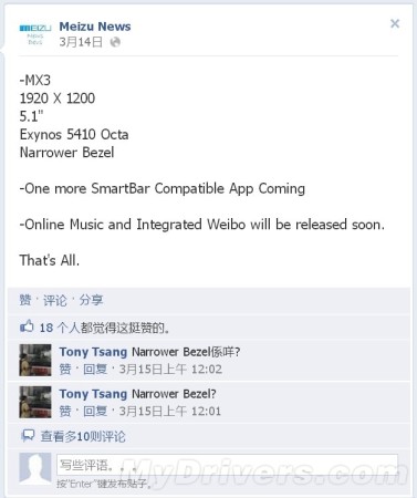 Также на прошедшей неделе появилась информация о готовящемся к выходу флагманском смартфоне Meizu MX3. Девайс станет продолжением модели MX2, которая вышла на прилавки в декабре прошлого года. На сегодняшний день об устройстве известно немного – он получит 5,1 дюймовый дисплей разрешением 1920х1200 точек и процессор Samsung Exynos 5 Octa 5410 (такой же, как и у Samsung Galaxy S4).