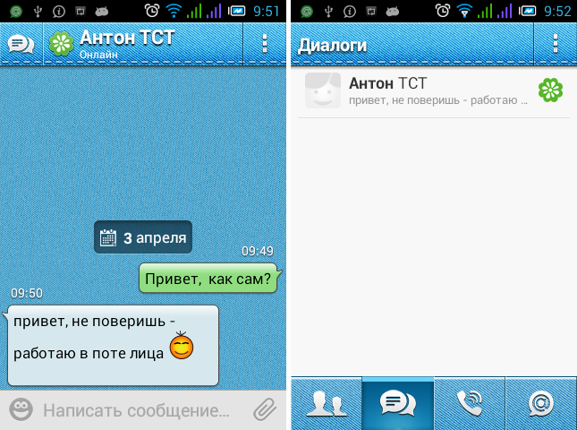 Основное диалоговое окно мобильного «Агента» содержит 4 вкладки – «Контакты», «Диалоги», «Звонки» и «Профиль». О назначении каждой из вкладок можно легко догадаться по их названиям, отмечу лишь несколько моментов.