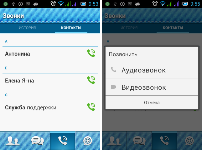Список контактов, которым можно позвонить, находится на вкладке «Звонки». Там же доступна история голосовых и видео вызовов.