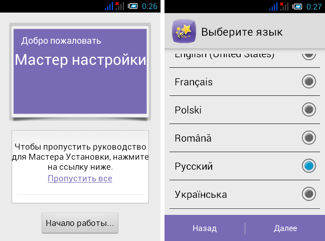 Но вернемся к Alcatel One Touch Upgrade S. При запуске будет предложено выбрать язык пользовательского интерфейса и модель мобильного устройства.