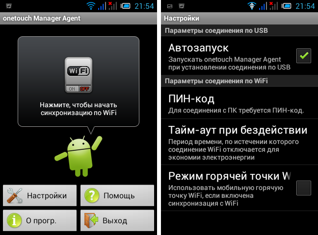 Помимо USB-подключения, компьютер и смартфон, находящиеся в одной сети, могут быть сопряжены через Wi-Fi, для чего запускают OneTouch Manager Agent и нажимают кнопку «Wi-Fi». При необходимости смартфон сам может выступать в роли точки доступа для работы с OneTouch Manager. В этом случае для установки Wi-Fi соединения между компьютером и смартфоном достаточно будет с компьютера подключиться к Wi-Fi-сети созданной мобильным устройством.