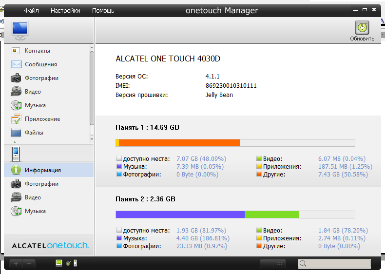 Рассмотрим возможности каждой из вкладок основного диалогового окна OneTouch Manager подробнее. Область «Устройство» состоит из 4 вкладок, о возможностях которых можно легко догадаться по их названиям. На вкладке «Информация» отображаются основные сведения об устройстве – версия операционной системы и программного обеспечения, также данные об использовании памяти, с разбивкой по типу контента.