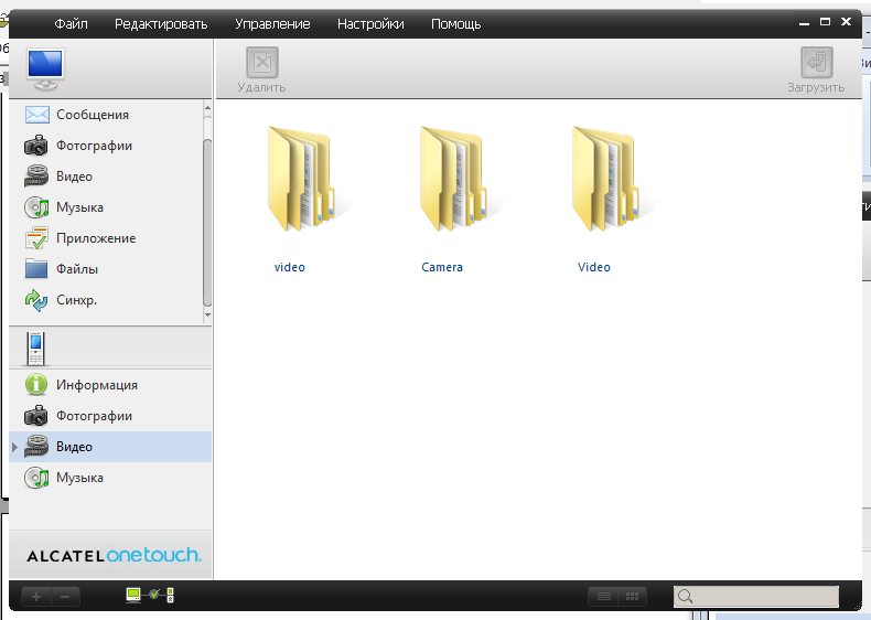 После установки соединения информация о смартфоне будет отображена в основном диалоговом окне OneTouch Manager Agent. Как и у других аналогичных программ, его основное диалоговое окно состоит из двух областей, обозначенных значками «компьютер» и «мобильный телефон». Для загрузки информации находящейся на мобильном устройстве, в зависимости от выбранной вкладки, используется кнопка «Загрузить» или «Синхронизировать».