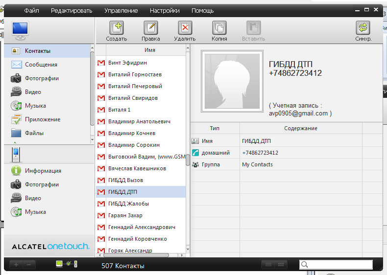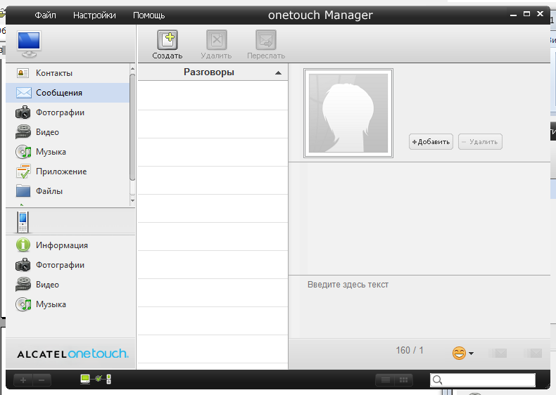 В области «компьютер» количество доступных вкладок больше, частности доступны контакты и сообщения. При работе с контактами посредством OneTouch Manager их можно создавать, править, удалять и копировать, а для сообщений доступна функция их создания с компьютера.