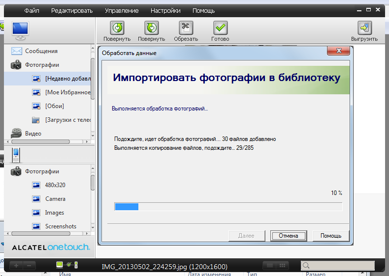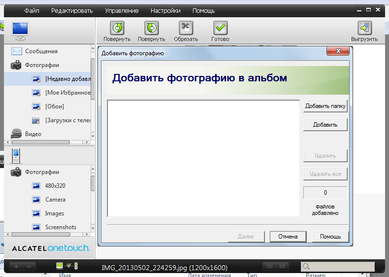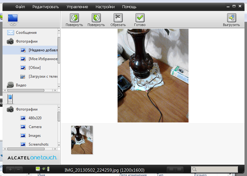 При работе с фотографиями в отдельные папки выделены недавно добавленные (импортированное в приложение) фото, а также обои. При просмотре фотографий доступна их обрезка и поворот, а также выгрузка отредактированного изображения на мобильное устройство. Кроме того, в OneTouch Manager можно импортировать любые другие фотографии или папки с фото, хранящиеся на компьютере.