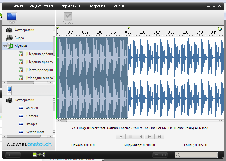 Из функционала работы с музыкой отмечу, что трек можно не только прослушать, но и обрезать (может пригодиться при создании рингтонов). Также в OneTouch Manager можно создавать свои списки воспроизведения, однако в целом функции по работе с музыкой достаточно примитивны.