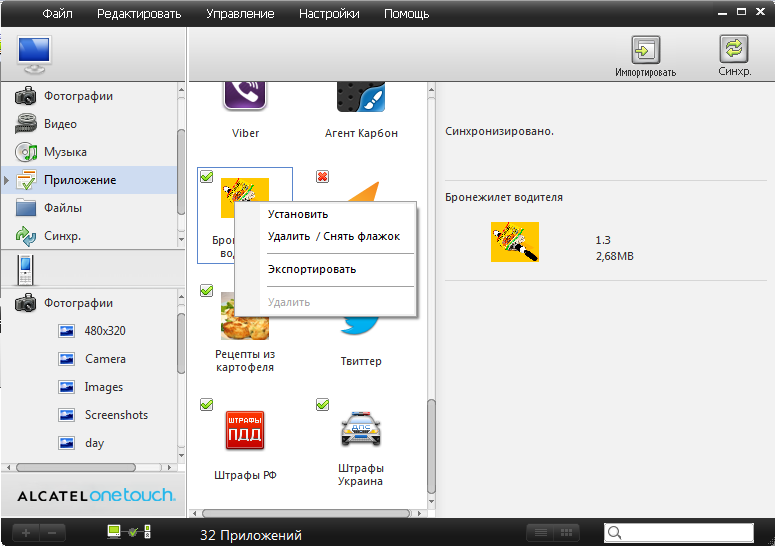 Вкладка «Приложения» используется для работы с установленными на устройстве программами. Доступны импорт и удаление приложений с мобильного устройства, а также их экспорт в apk-файлы.