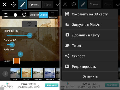 Фото для обработки можно как выбрать из галереи, облачных сервисов или социальных сетей, так и сделать, не выходя из приложения. Аналогично многим другим программам, поддерживается возможность поделиться своим фото через привычные электронную почту, SMS-сообщения, Facebook, Twitter, Flickr, Picasa, Dropbox, Fouresquare, Tumblr, Blogger, Wordpress, DeviantArt, а также в собственной сети PicsArt.