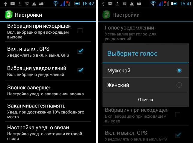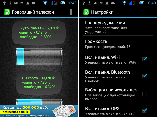 Приложение «Говорящий телефон» представляет собой информер, голосом озвучивающий состояние мобильного устройства. Какие именно события должны озвучиваться задают в настройках программы.