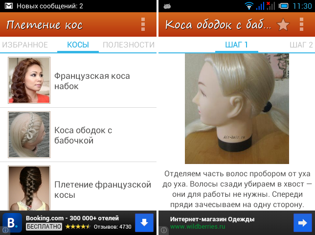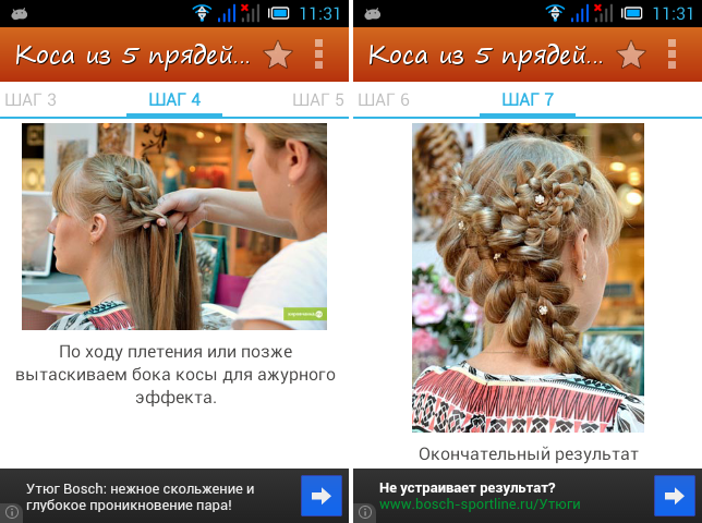 Как несложно догадаться по названию приложения «Плетение кос» оно предназначено для женской аудитории. По заверениям авторов программы «следуя пошаговым инструкциям с иллюстрациями и описанием, вы сможете заплести косу любой сложности». На текущий момент в активе приложения присутствует около 50 вариантов плетения кос, от обычных косичек-жгутов из двух прядей до кос оригинального переплетения пяти прядей, от основ плетения кос до мастер-класса по созданию сложных причесок с элементами плетения. Кроме того, программа дополнена рекомендациями о том, как отрастить длинные волосы и правильно за ними ухаживать.