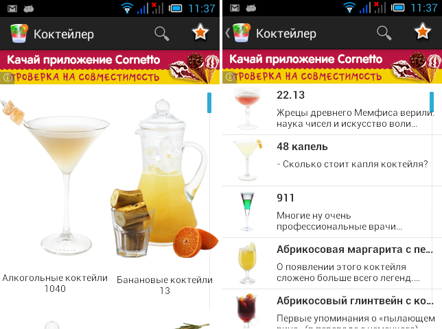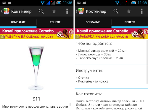 Аудитория программы «Коктейлер» куда шире – эта программа может пригодиться всем, кто хочет удивить своих гостей изысканным коктейлем. Что приятно – база рецептов (на текущий момент около 1100 позиций) доступна без подключения к интернету, а значит воспользоваться программой можно практически везде и без лишних расходов. Помимо рецептов коктейлей в приложении присутствуют легенды о коктейлях и сведения о необходимых для их приготовления ингредиентах. Также доступны поиск и возможность занесения понравившихся коктейлей в «избранное».