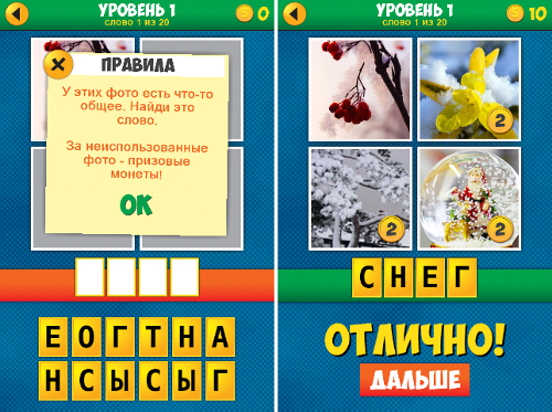 По своему геймплею два следующих приложения очень похожи – в обоих программах необходимо угадать слово, которое объединяет содержимое 4-х приведенных изображений. Кстати, такая преемственность программ не случайна – вторая программа является продолжением оригинала. Причем «продолжение» полностью на русском языке.