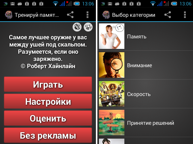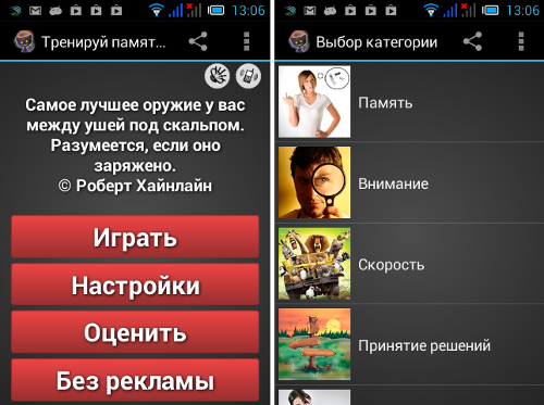 Разминка для мозгов предлагается и в программе «Тренируй память! Тренер мозга». Согласно описанию приложения «достаточно 5 минут в день для того, чтобы не только поддерживать свою память в тонусе, но и развивать ее!». При этом авторы подчеркивают что все это происходит «в игровой манере без напряга, надоедливых напоминалок, в удобное и комфортное время». Игровое содержание приложения включает в себя несколько упражнений, позволяющих развивать зрительную память, периферическое зрение, концентрацию внимания и быстроту реакции.