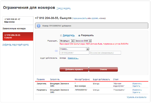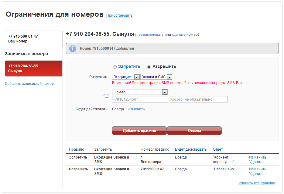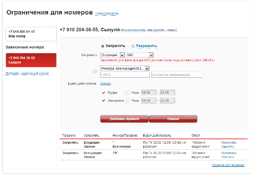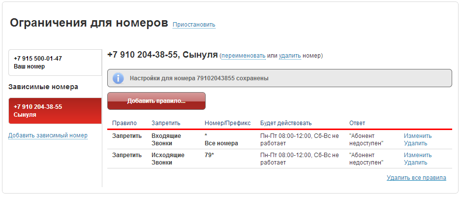 Для перехода к управлению зависимыми номерами – щелкают по соответствующей строке списка зависимых номеров. При этом на экране будет отображена информация о действующих для этого номера правилах. Все достаточно информативно и наглядно. При необходимости действие всех ограничений можно приостановить, для чего служит соответствующая гиперссылка. Кроме того, отдельно можно изменить или удалить любое из действующих правил. При желании зависимому номеру можно добавить имя, что особенно удобно, если функция родительского контроля используется на телефонах двух и более детей.