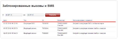 Просмотр списков отклоненных звонков и sms-сообщений доступен по гиперссылке «Заблокированные вызовы и SMS». Для каждого события (звонка или sms-сообщения) указывается дата и время, тип события, номера телефонов, а также использовавшееся правило блокировки. В случае если услуга «Черный список (ребенок)» подключена на нескольких SIM-картах – информация отображается единым списком, в котором видно с какого и на какой номер поступили заблокированный звонок или sms-сообщение. Выборка списка отображаемых событий осуществляется по интервалу дат.
