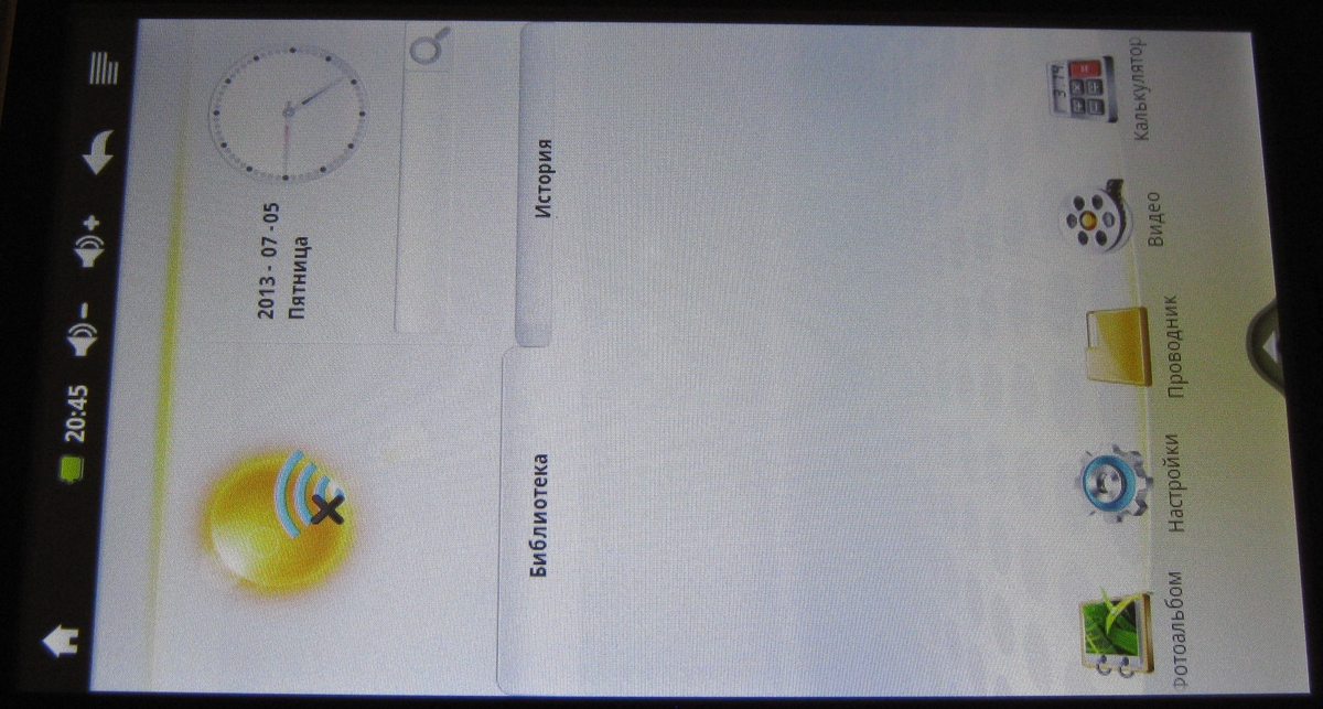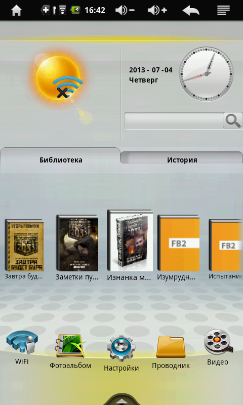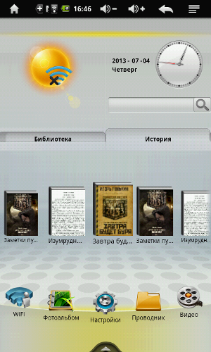 Программная основа TeXet TB-711A – Android 2.2 c оболочкой «Книжная полка». Аналогичный набор программного обеспечения используется и в ряде других ридеров на базе Android. Внешне смотрится довольно неплохо. Интерфейс «Книжной полки» состоит из двух вкладок – «Библиотека» и «История», содержащих, соответственно, полный список находящихся на устройстве книг и тех, которые были недавно открыты. Отображение книг в списках осуществляется по кругу. Кроме того, поддерживается поиск.