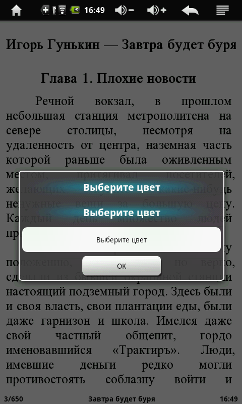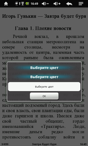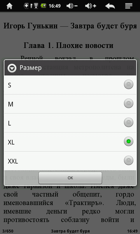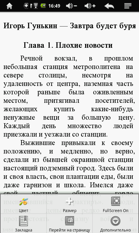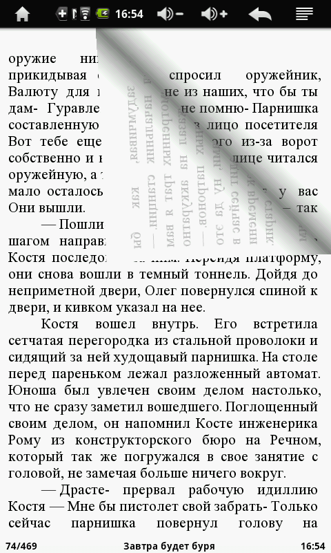В режиме чтения все достаточно стандартно. Листать страницы можно как кнопками, так и скользящим движением по экрану.