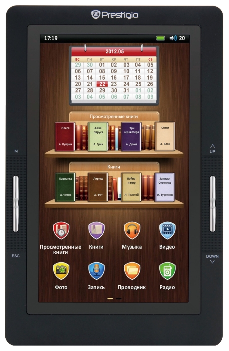 Довольно простое устройство, без Wi-Fi, но с 7-дюймовым WVGA-дисплеем, 4Гб встроенной памяти, слотом microSD (до 32 Гб) и аккумулятором емкостью 2500 мАч. Из книжных форматов поддерживает TXT, fb2, ePub, RTF, MOBI, а из остальных – JPEG, BMP, TIFF, GIF, PNG, MP3 и HTML. Об используемой программной платформе в описаниях не упоминается. Ценник – около 2,5 тысяч рублей.